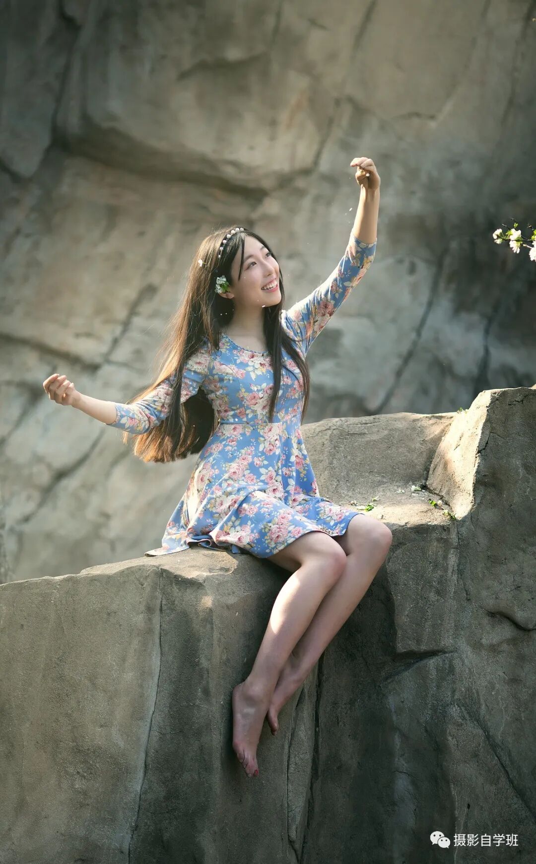 我们说拍摄姿势要张弛有度,但是太夸张也不好看,上图的姿势和表情都有些夸张,而且坐在高高的岩石上挥舞,不仅没啥美感,而且还有点看似不正常,虽说肢体打开了,但是过于夸张,也就不那么美观了。