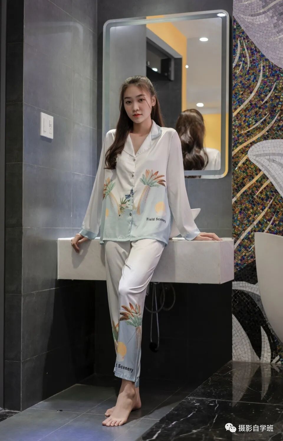 出差、旅游,在酒店里就能拍出好看的照片,手如果没地方放,也不要像上图这样,而完全可以像下图这样,手放到洗手台面,重点是,两脚前后错开,拍摄机位稍微低一点,可以让人显得更高,更瘦。