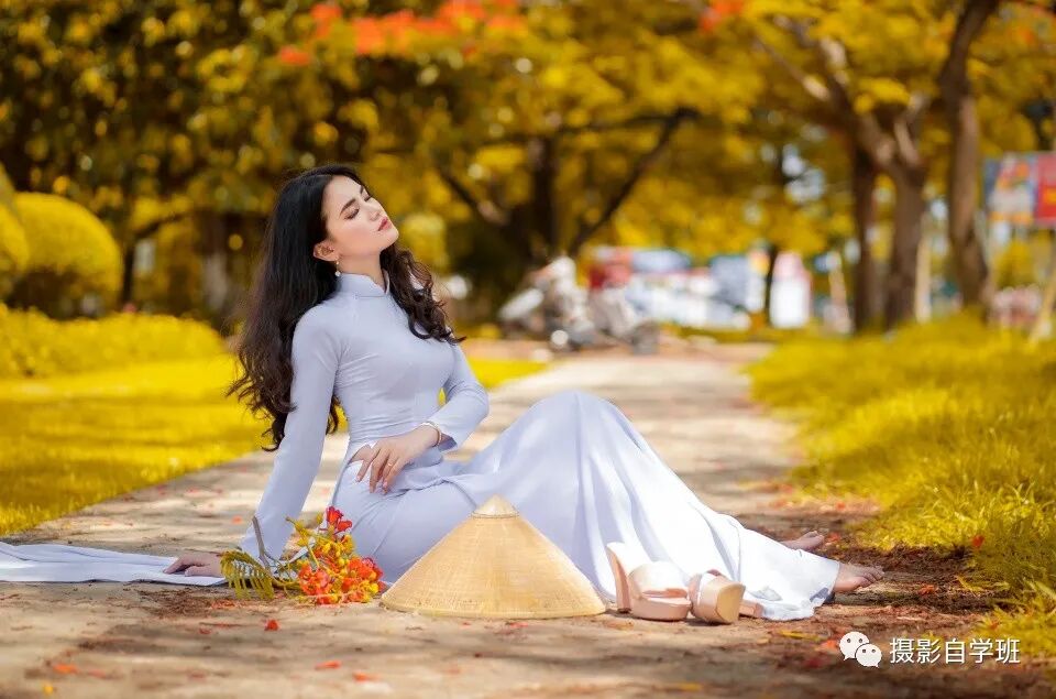 有的时候,衣服太露,像上图这样。或者如果身上有伤。都可以让摄影师离被拍的人近一点,同时,用现场的花叶、枝条,挡住不方便露的地方,照片显得含蓄,自然。人的姿势,也不要像上图这样,一只手放在头上,太显刻意,就不自然了。