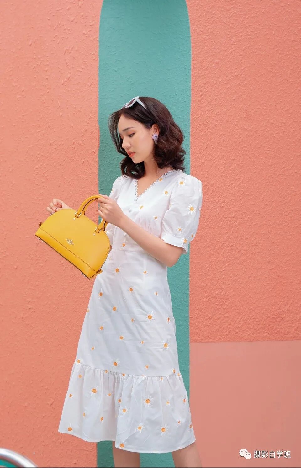 当遇到这种纯色墙面的时候,完全可以让人也穿得相对纯净一点,站在墙前拍摄,就很好看啦。夏天这种姿势,随手拿个包,手里摆弄包,轻松获得好姿势,但不要有下图左下角这样的小瑕疵。
