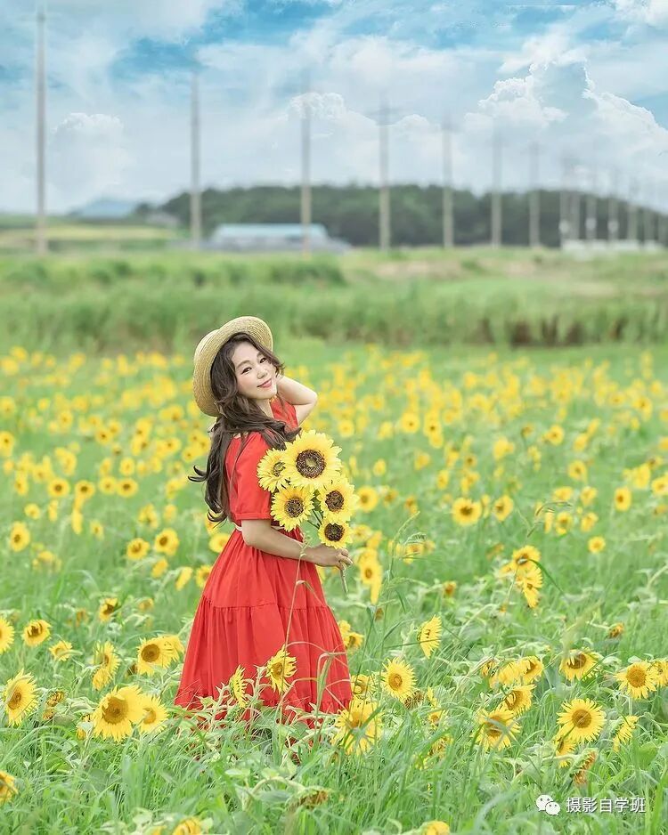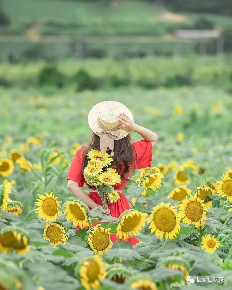 这一条口诀,就能帮你摆出万千姿势,当你没有姿势可摆的时候,你就准备道具。有道具,摆姿势就更简单了,但是,道具也不是随便准备的。记住道具的要点,要和拍摄环境相关联!比如图2、图3、图4,被拍摄的人手中拿着的向日葵,和现场环境的向日葵一样,这就叫关联。啥叫不关联,比如,在花丛中拎个公文包,就是不关联,不关联就不好看。