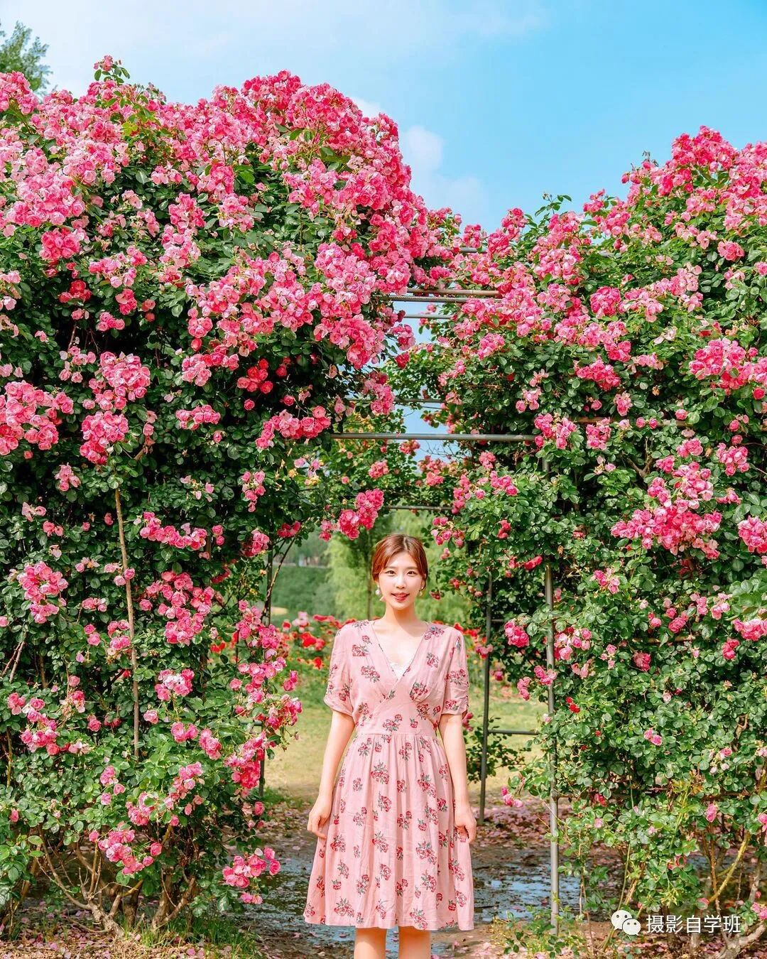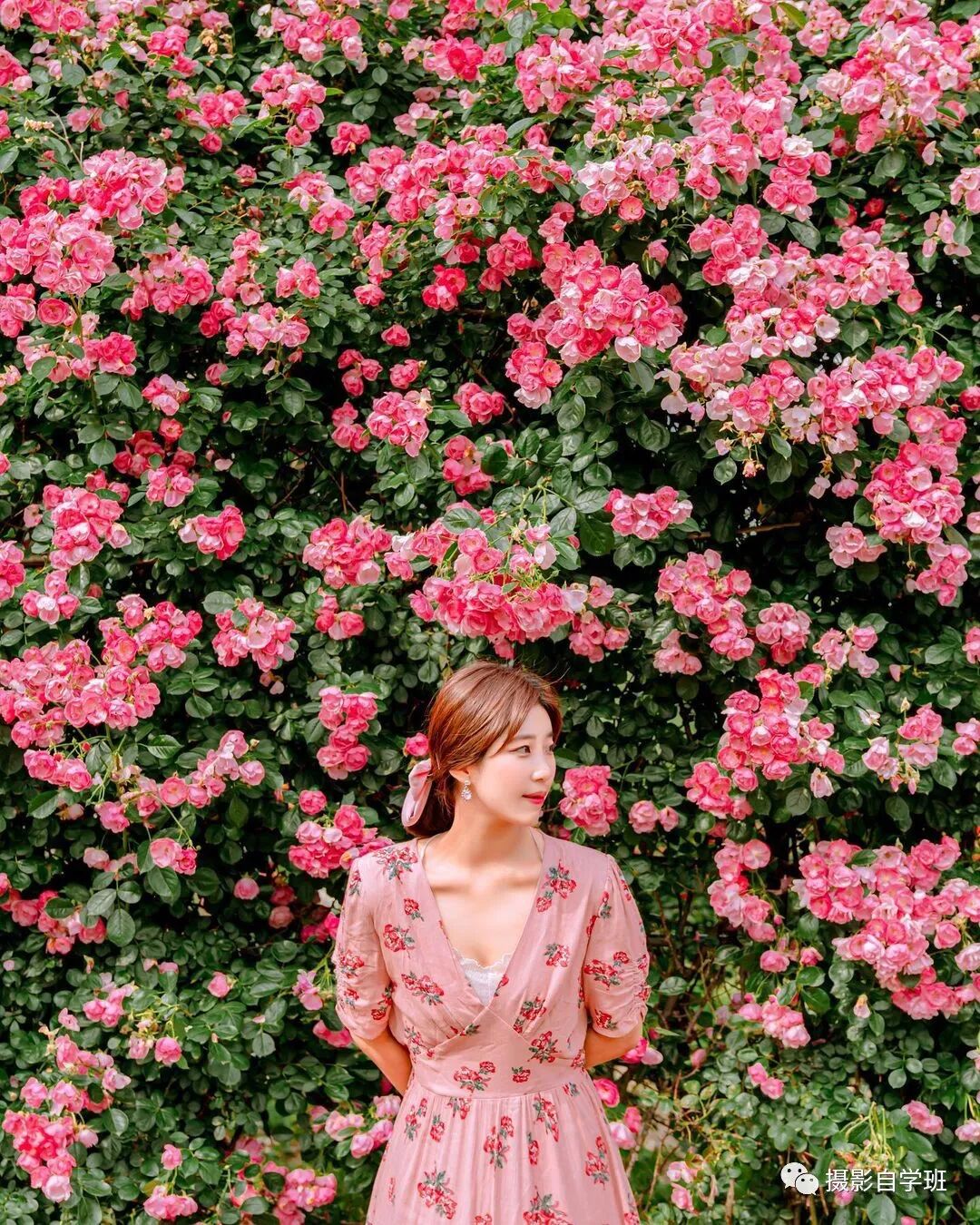 避免尴尬,就是不看镜头,此时双手背后,选一面花墙作为背景,整张照片就更加好看了。这里除了姿势以外,人物的衣着也是重点,衣服上的碎花和背景的花朵相呼应,让整张照片看起来更协调。