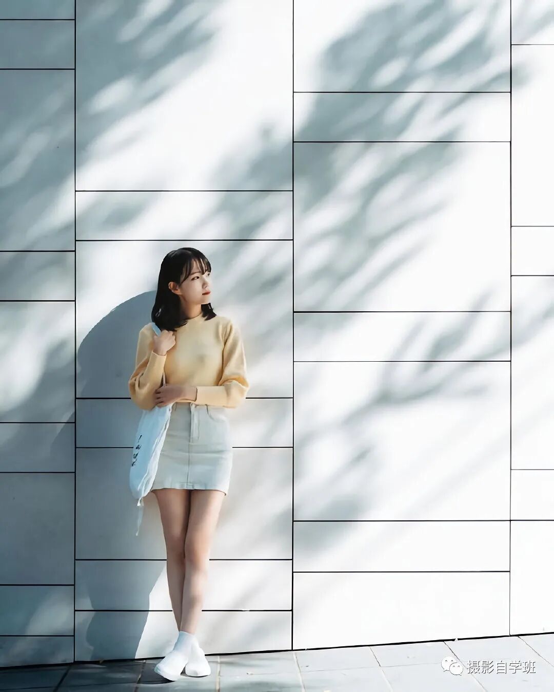 不管是地上的光影,还是墙面上的光影,都是很好看的风景。如上图,树木影子的映射在墙面,形成这种斑驳的光影,人物靠墙站立,注意正面站姿基本和上面一致,存在的差异是看镜头或者不看镜头,都很耐看。
