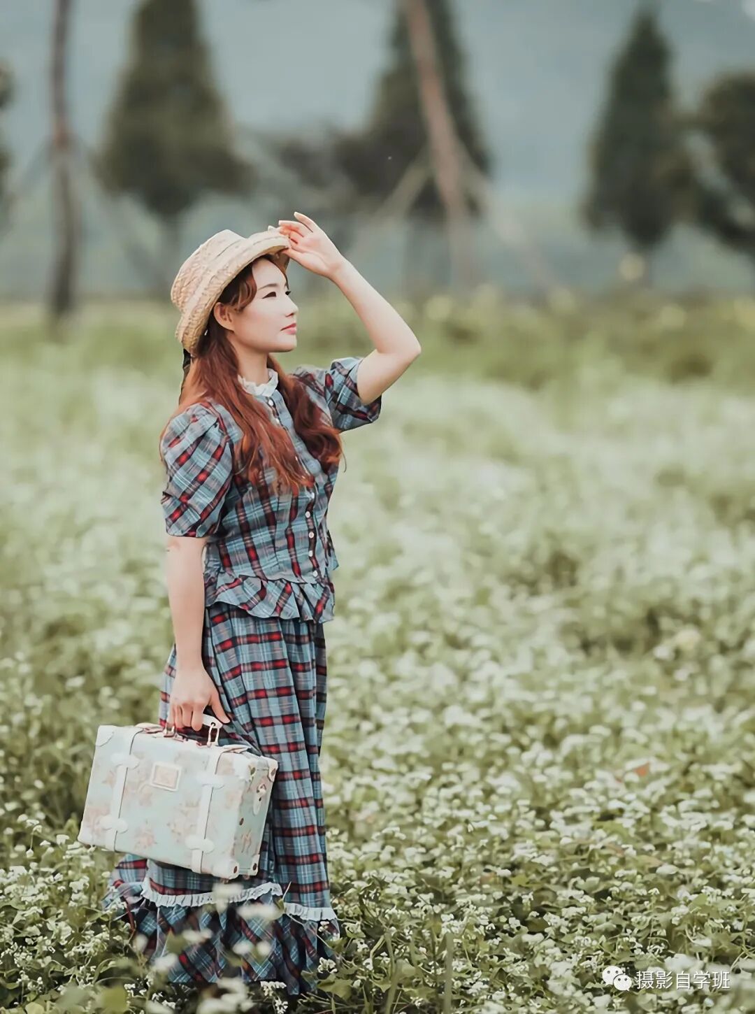 一只手扶着帽子,另一只手拎着包,看向远方,大气从容,诗和远方一个都不能少。