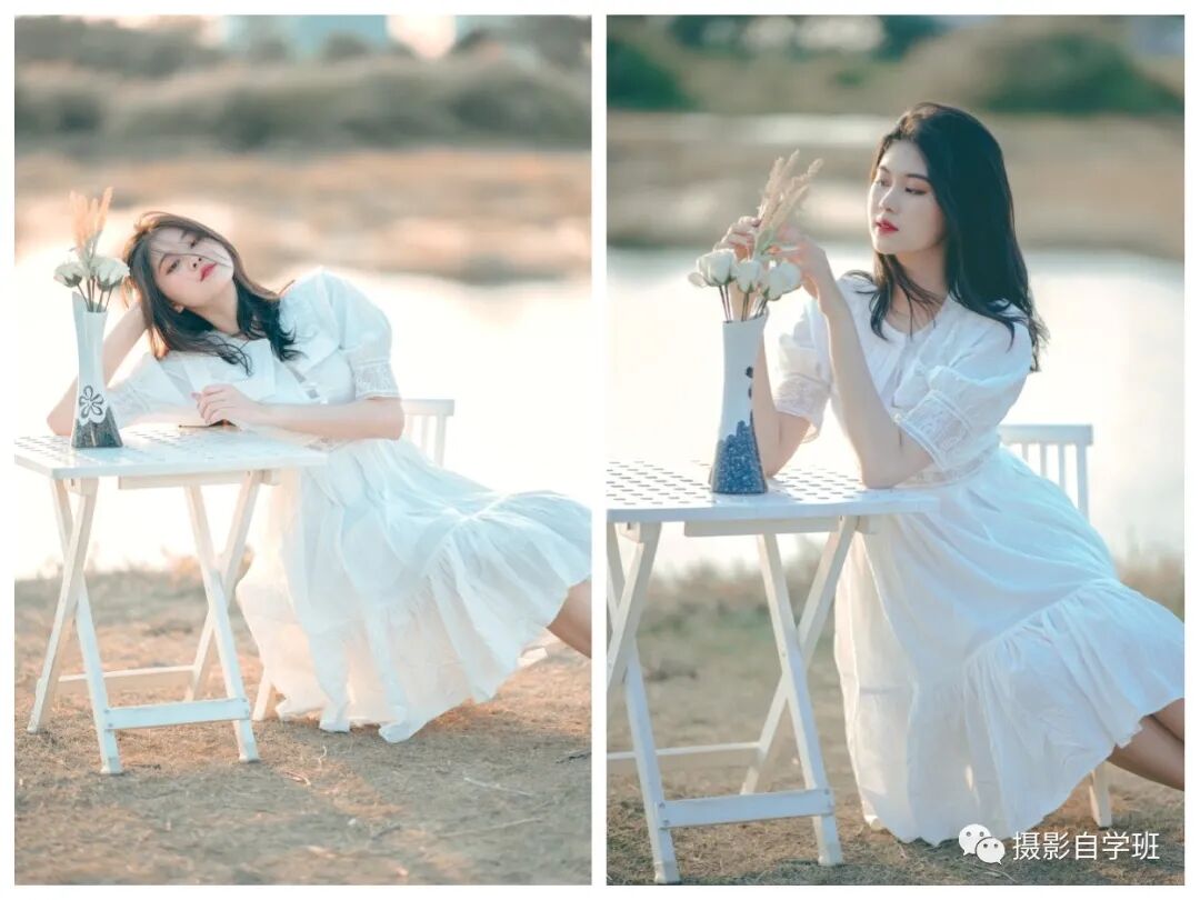借助道具,搭配桌椅。我们拍摄的姿势,多源自我们生活的常态,胳膊杵在桌子上,慵懒的感觉,油然而生。桌上再放一些花瓶,或者其他道具,让人物有摆弄的东西,这样也会摆脱拍摄的拘谨,以达到人物放松的状态。