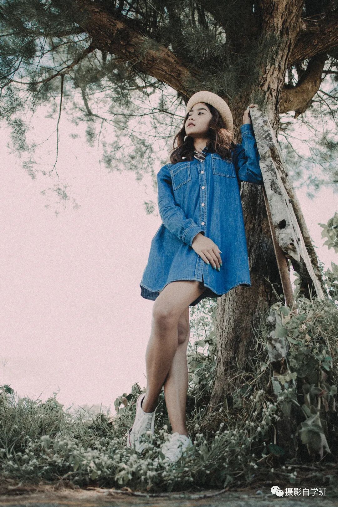 人物上身前倾,另一手扶着树枝或者树叶,另一只手搭在后面。看向镜头或者不看镜头,都是一种舒服的姿势,这个注意吸气一点,这样既可以收腹,也可以让背部挺直,尽显人物气质。