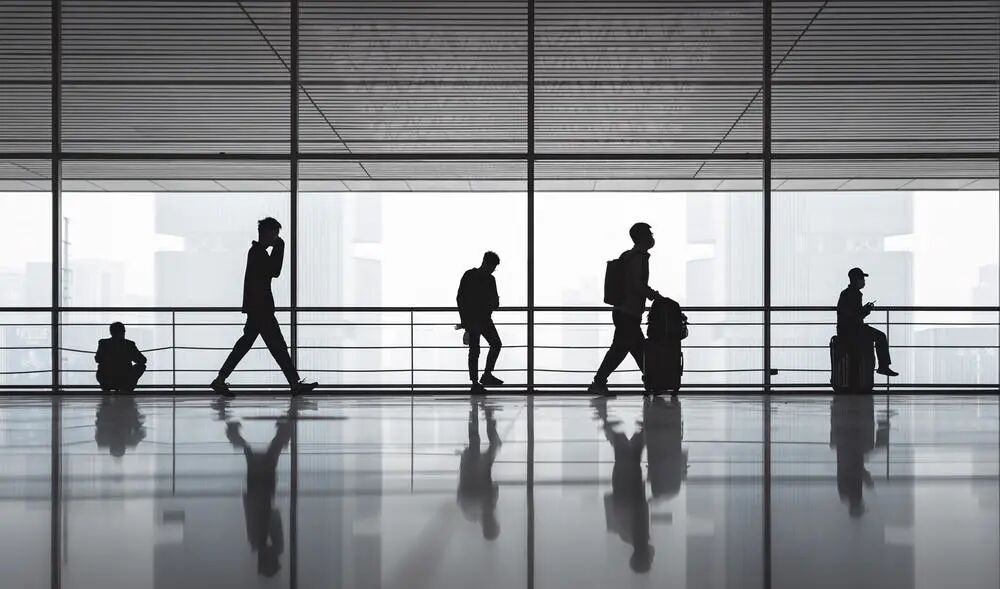 点评:挺好的火车站群像。场景就是常见的火车站,飞机场。然后大场景,干净,人物剪影形式出现。那么要的就是人物的状态。