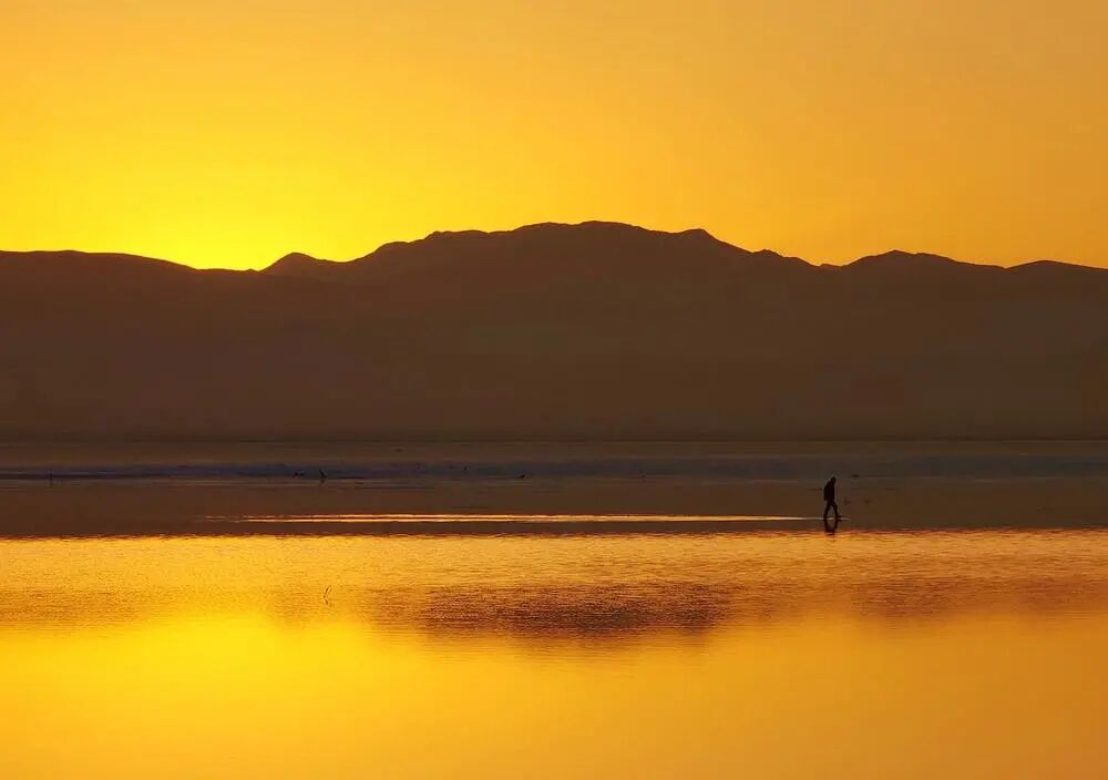 余晖透过山川在高原盐湖上撒下金色倒影,此时有人穿湖而过,身后留下长长的水迹。夕阳的一抹金色将这一切融为一体。by vivo X50 pro +