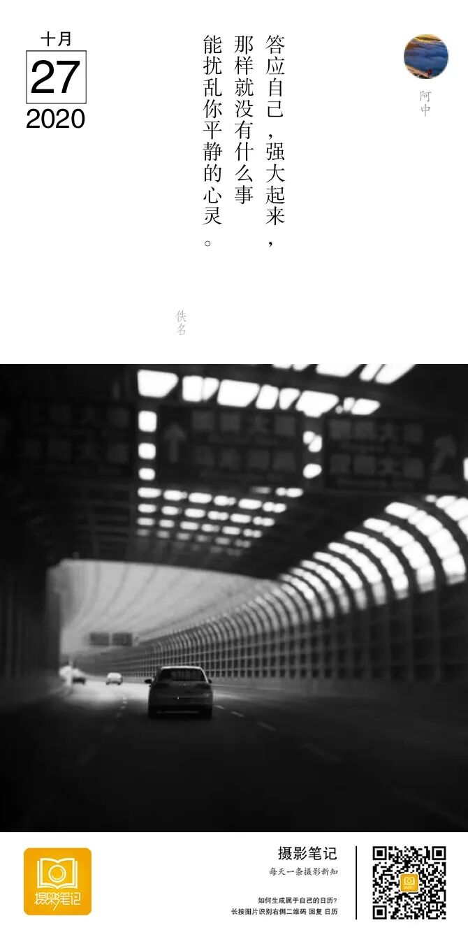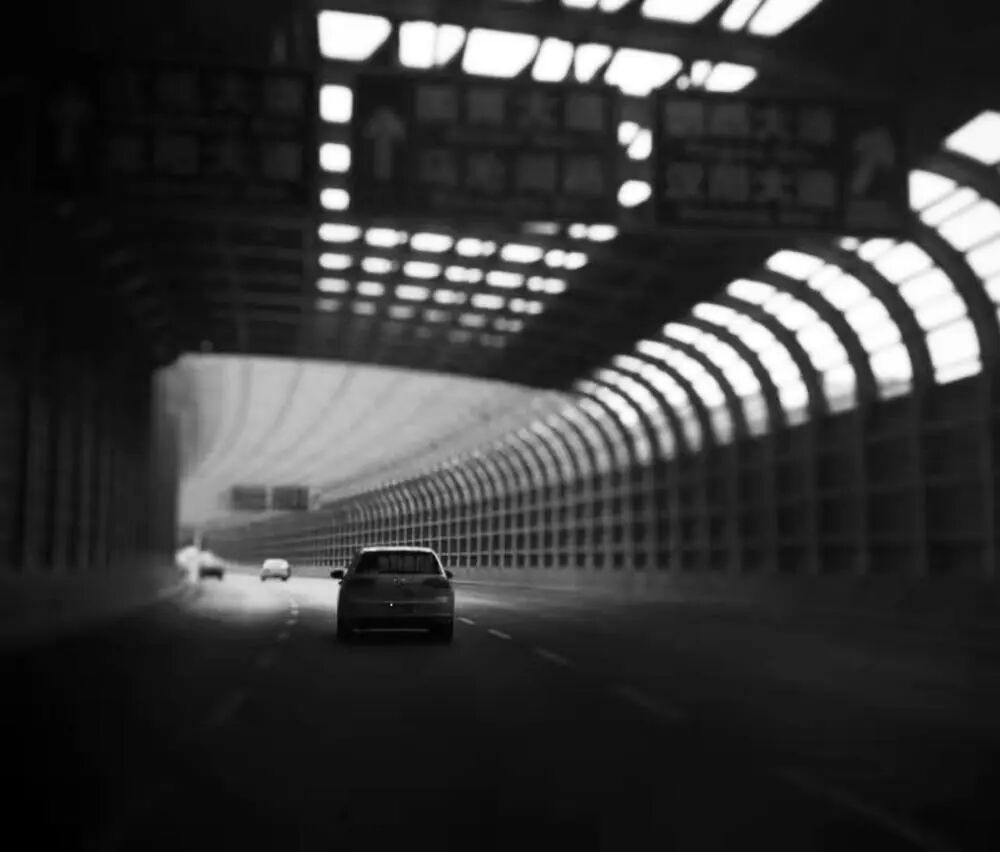 8月份工作不顺利,比较低沉的时候,行车经过鹦鹉洲大桥汉阳桥头,这里有一段长长的隔音棚,隔音棚里面光线相对较暗。觉得光线明暗对比,还有隔音棚柱子线条的延伸感都适合拍,刚好前方有一辆车,于是手机抓拍了几张。车马上就走出暗部,觉得这张比较适合自己当时的状态——处于低谷,再坚持一下就可以冲破黑暗,迎接光明。镜头模糊,让上方的字不那么显眼,突出前方小车,黑白处理,加了明暗对比。请校长点评!