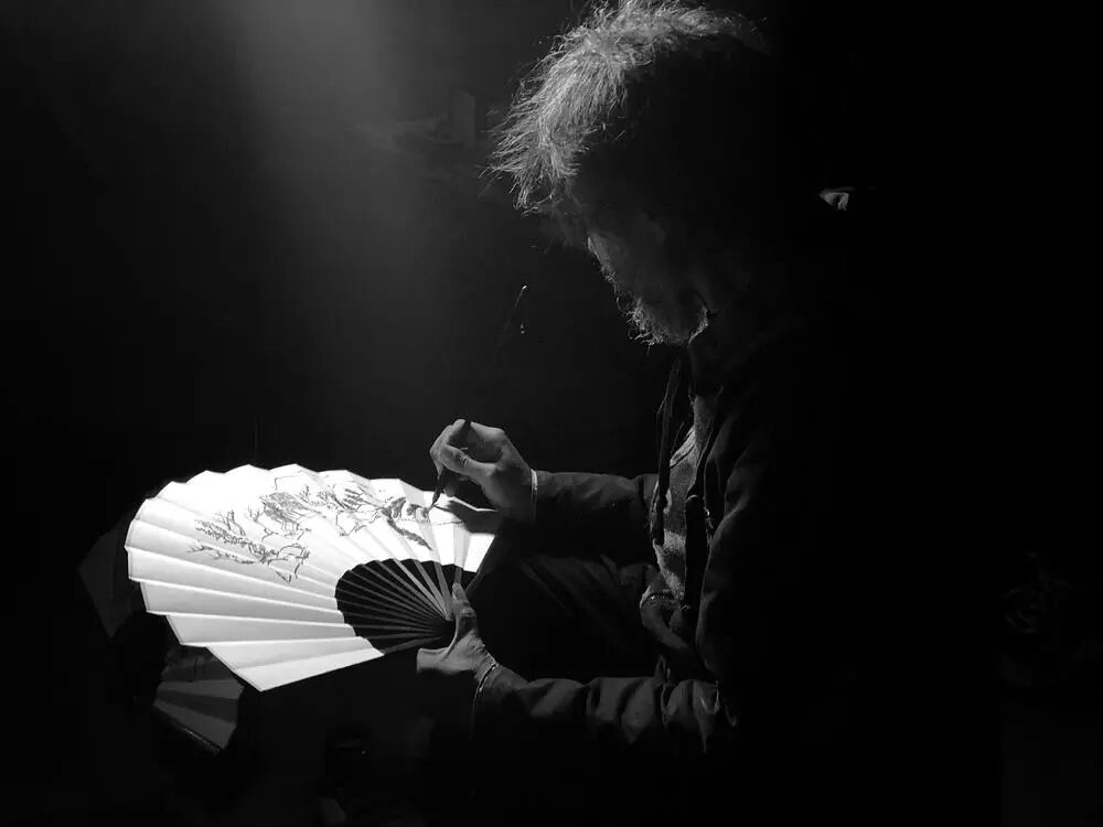 晚上路过夜市,有个靠画扇面营生的老人,于是用手机拍了一张。后期用手机,转黑白并用画笔降低环境的曝光。稍微降低了一下地上扇子的曝光以突出主次。求校长点评。