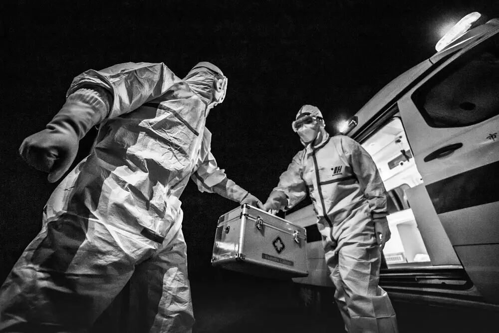 当时正值疫情结束封锁,然后身为医院职工,想记录一下我们医院的忙碌。在一次出车接病号的时候,我用广角拍摄到了他们交接药箱的一瞬,后期了黑白。