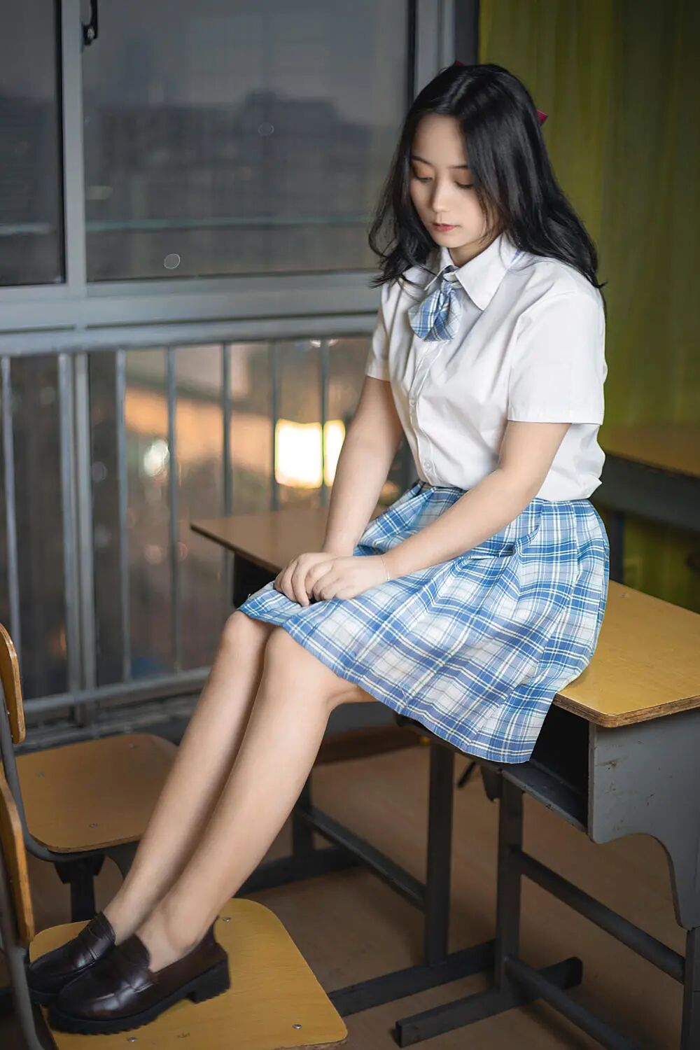 点评:咱们拍一个人像,要考虑其合理性。比如一个JK风格,在教室里。为什么要她坐在桌子上,穿着鞋踩在椅子上呢?为什么要天黑了拍,这时候不应该打水回宿舍了么?
