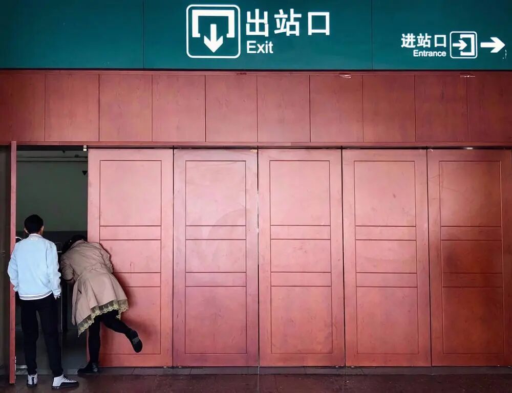 地点,时间:在火车站拍的,彼时刚好是一班车的人全部下车后出站口关门的时候。器材:手机。后期:这张图调整过两次,第一次裁掉了上面绿色的出站口的牌子,只留下了红色的门和人。看起来画面很整齐,但感觉有点不明所以。所以就保留了那个牌子。痛点:拍的时候没有横平竖直,后期调整的时候总是当时觉得这次透视没问题了,导出来一看又觉得是歪的,很难受
