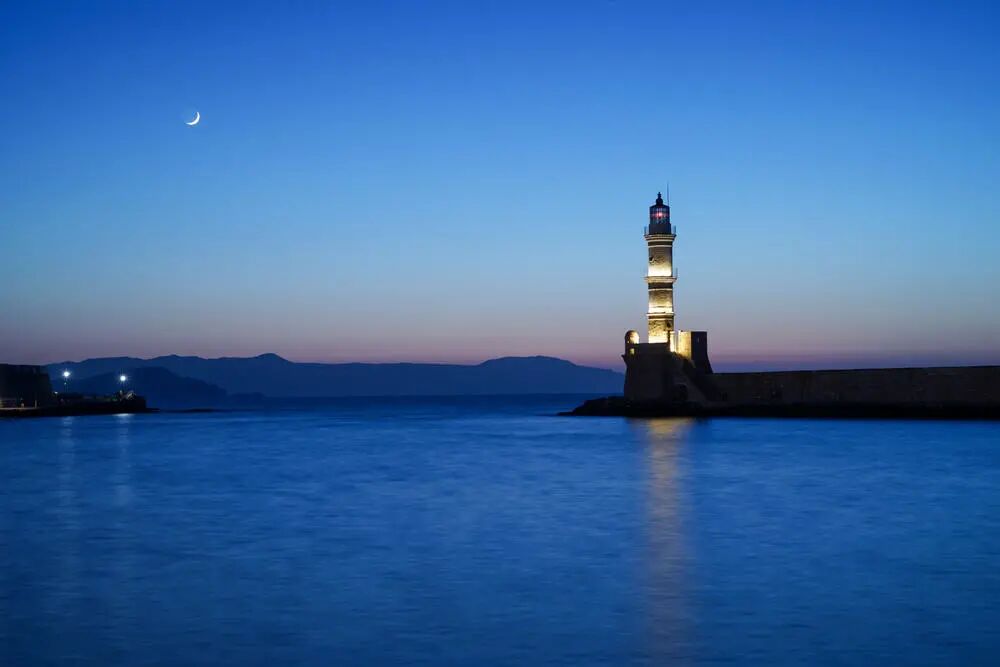 希腊小岛边的灯塔,特地等日暮之后的蓝光时刻,想烘托静谧安宁的气氛。