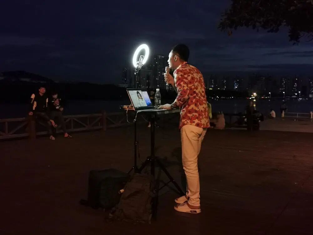 播客,傍晚三亚河边平台上好几波直播的播客,选了一个拍照