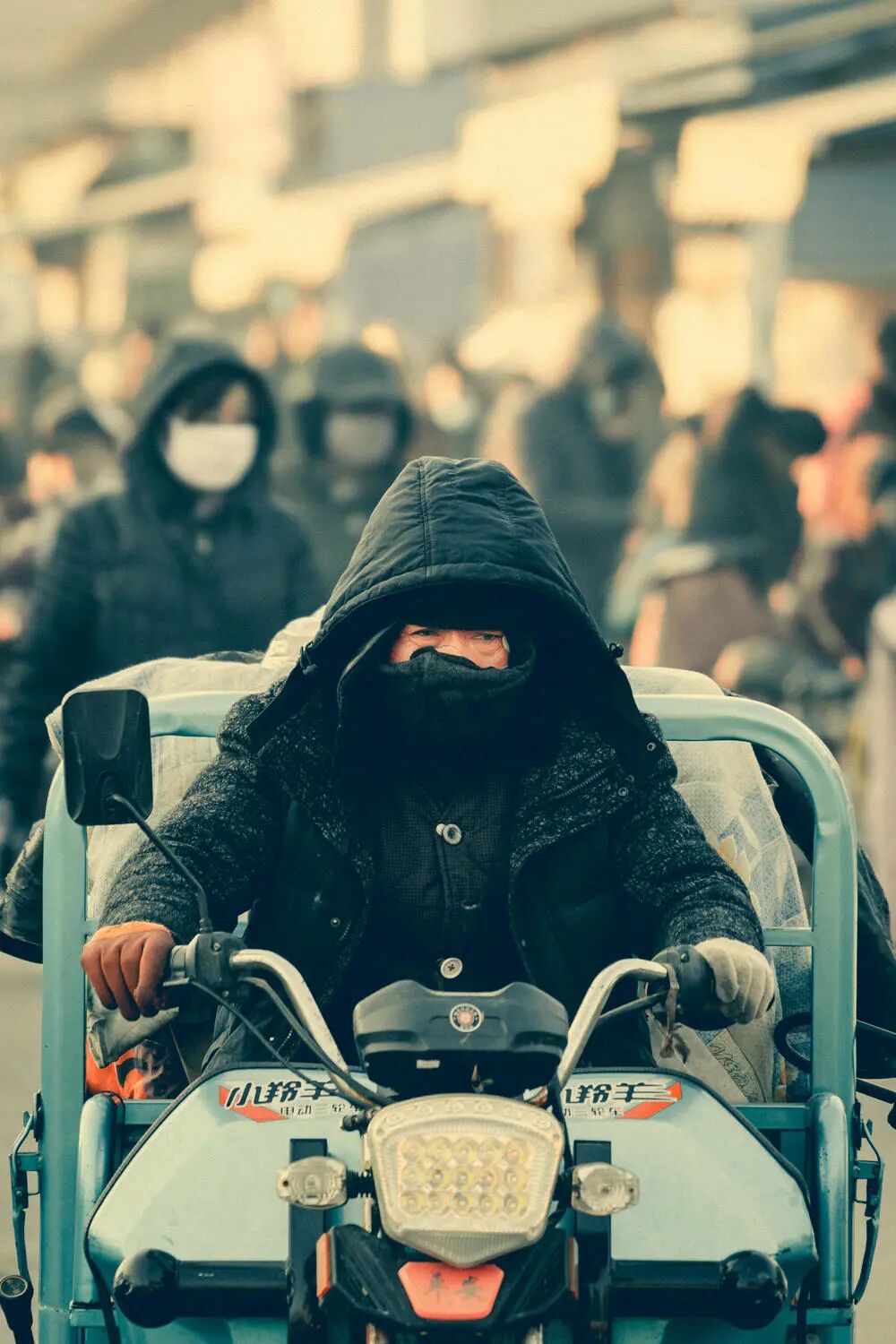 去蔬菜批发市场买菜,看见一位骑车的商户,穿着厚厚的棉衣只露出了双眼,身上还留着刚下的雪粒子。