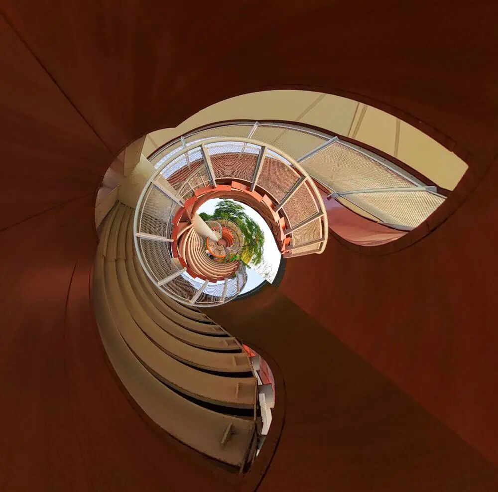 本张照片于9月底在北京一家新开放的湿地公园中用手机拍摄的,公园很大秋季还没什么植被,有点荒凉撒。原图是个亭子,二层高,有个旋转楼梯,本来准备从上面拍个俯视图,但上去发现中间有个柱子,拍不出那个旋转效果,并且只有两层深度也不够。所以最后从楼梯口拍了一个正面图,就是特普通那种。因为特别想要那种很深邃的旋转楼梯效果,后期就在MIX软件里用“小星球”的工具将楼梯正面图进行缩放、旋转,以对角线为轴,尽量对称。此外这个工具付费后可以去掉下面的水印,而我是直接把水印裁剪掉的。我也是初学者,拍的也比较简单,也没有太多技巧分享给大家了。