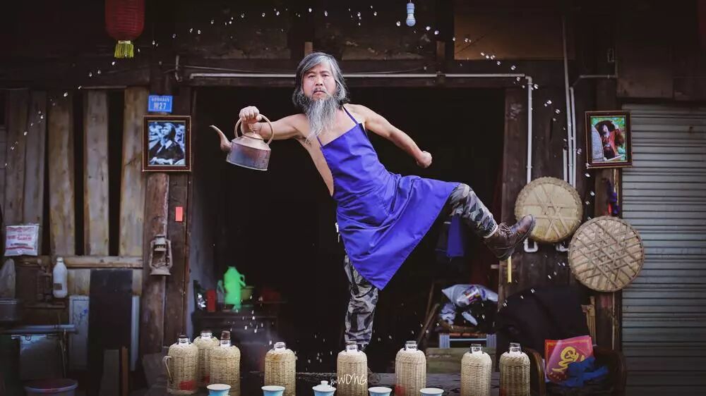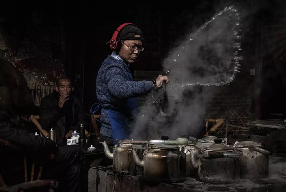 这张照片,瞬间很好,这是一个印象。水甩出来很好看。人物表情很认真,很有仪式感。然后我们看场景,感觉是老茶馆。然后画面中唯一反差色的就是红色的耳机。让画面不仅仅有年代感,而且更具年代感。我们看到这样的场景,总觉得有年代差,但是这个和环境格格不入的耳机,却可以让画面更具年代感。