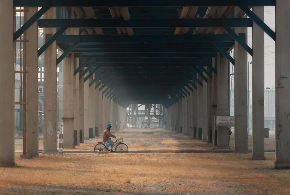 取景:化工厂里的管廊下,站到正中间感觉纵深感很好,下午三点多阳光斜射过来光线也不错,剩下要做的就是等个人出现。曝光:管廊上半部都是深蓝色,偏暗减了曝光。虚实:没有用大光圈,因为想保留管廊的纵深效果,展现框架的结构。只是管廊的尽头有些乱。构图:把人物放在下三分,放在了光线明亮这一侧,同时前进方向留的多一点。