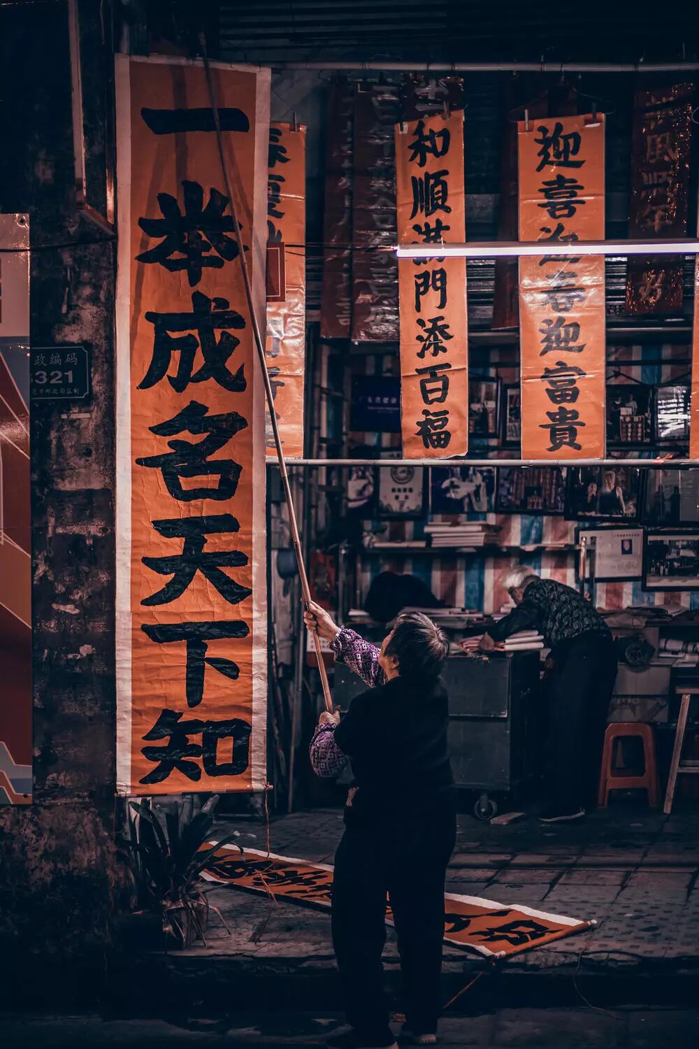 《老伴,收档咯》路过一个卖对联的店,老两口正在收拾挂在外面的对联准备收档,觉得挺有意思,拍了几张,这张人物状态相对好一点。背景:元旦,东莞石龙镇在中山路老街举办第一届骑楼文化节,带着相机转了一圈拍了些照片,挑了几张自己相对比较满意的,上传为一个照片集,请校长点评,谢谢~