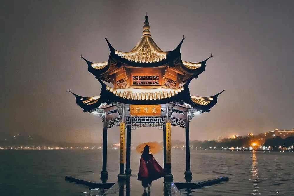 西湖翠光亭,在此可远眺苏堤和三潭映月,也是观西湖日落的好去处。