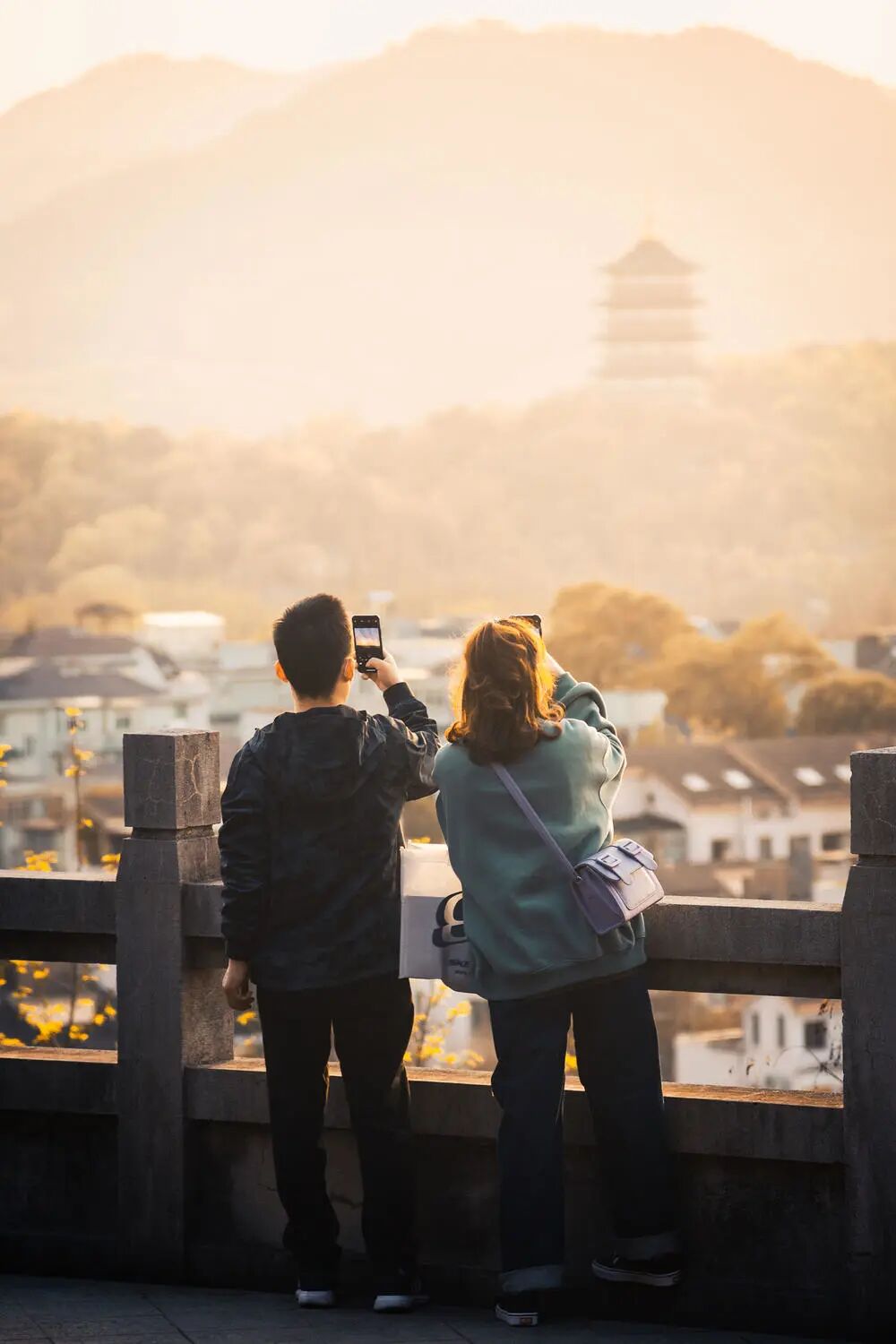 甚至你该离更远点。再长焦去拍摄。太阳可以作为更大的背景,没准能框住俩人。