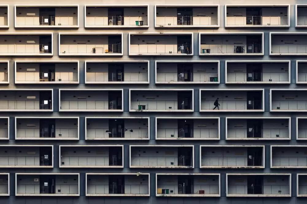 这是深圳大学的学生宿舍,每个格子对应一间宿舍,感觉很有特色。拍的时候一直在等待光线,恰好最中间那层走过来一个人,连续就拍了几张,最后选了人物状态还不错的这张。后期主要也是冷暖对比思路。