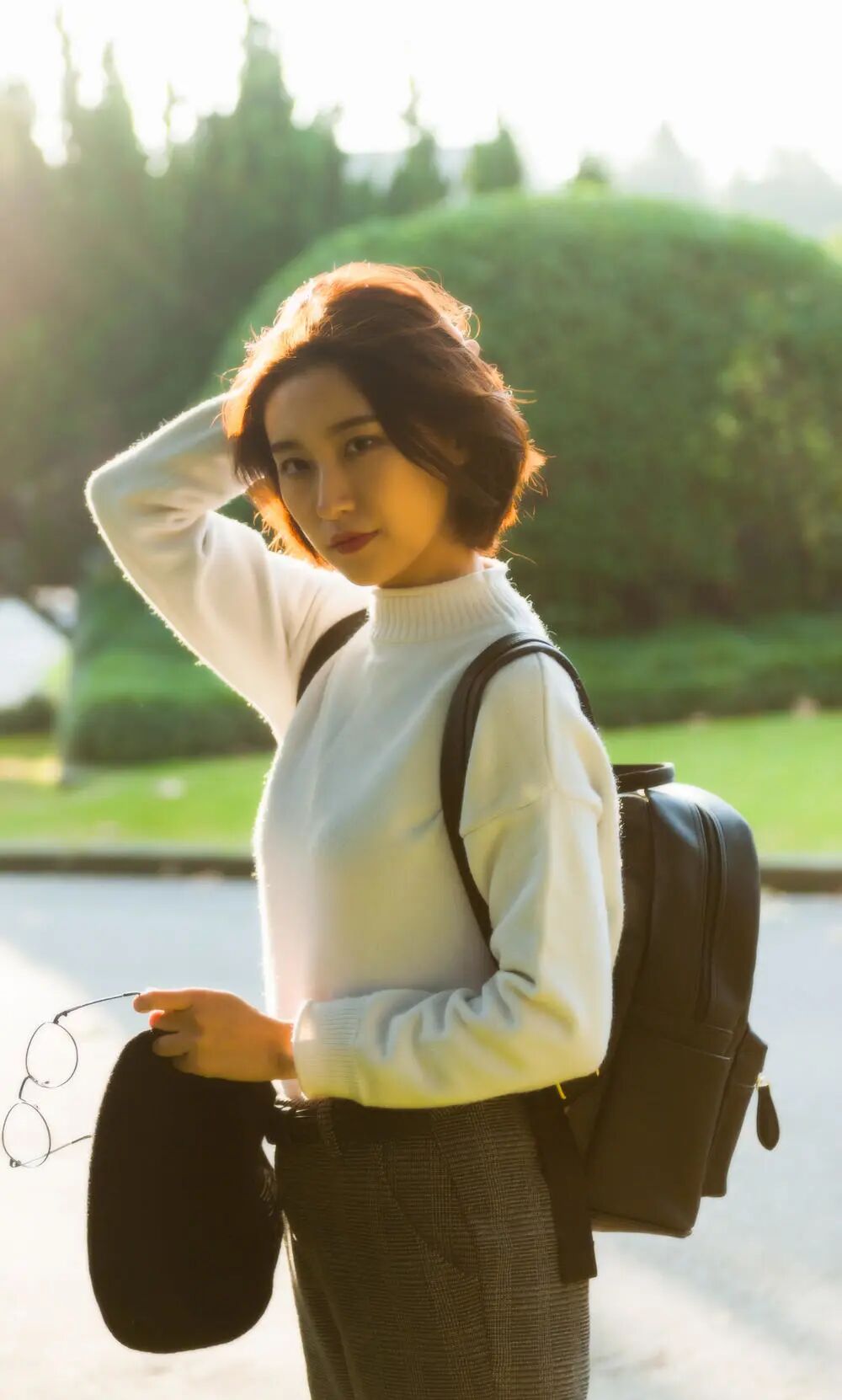 这照片是疫情基本快结束的时候拍的,窝在家几个月赶紧拉上同学出去实践。但植物园到处都是人,就看到一面都是藤蔓的墙,想着是拍一个林木少女的那种她手闲着没处摆我就让她随便碰几片叶子。但现在时间久了再回头看看总感觉哪里不舒服