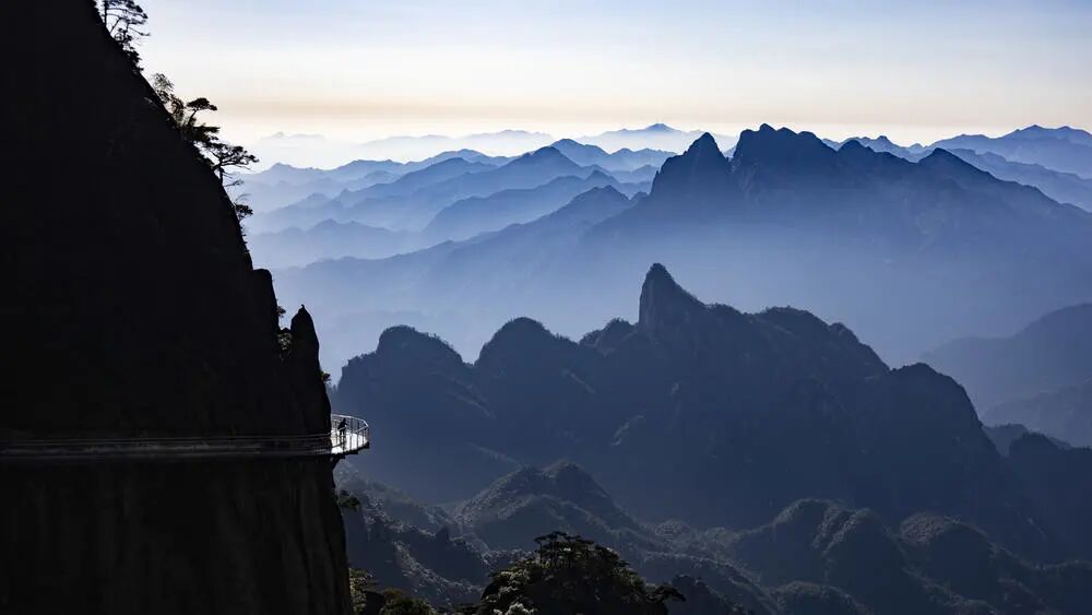 元旦和女友爬三清山这天的西海岸景区有云雾看起来很美,再加上这个位置可以看到前方的玻璃栈道,我就在等一个人过来就拍下了这一幕。左边的松树之类的剪影也很好看。