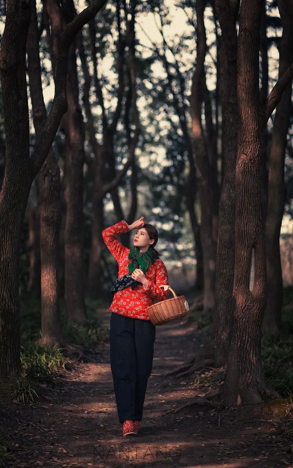 当时中午时分,外面光线比较强,阳光从树叶间透下来,使得林间小道光线相对柔和。于是选择林间小道为背景,让小姐姐从小道尽头走过来进行抓拍。林间小道相对较暗测光后降低了曝光,为了让美丽的小姐姐在树林里更加突出,让她走过来遇到阳光时,自然抬头看一眼,让光线撒在小姐姐的脸上和身上,起到补光的作用。中心构图上方留白,让小道和树林形成空间感。毕竟是在公园,加大光圈虚化了背后的杂物和房子。后期加强了冷暖对比和色调。