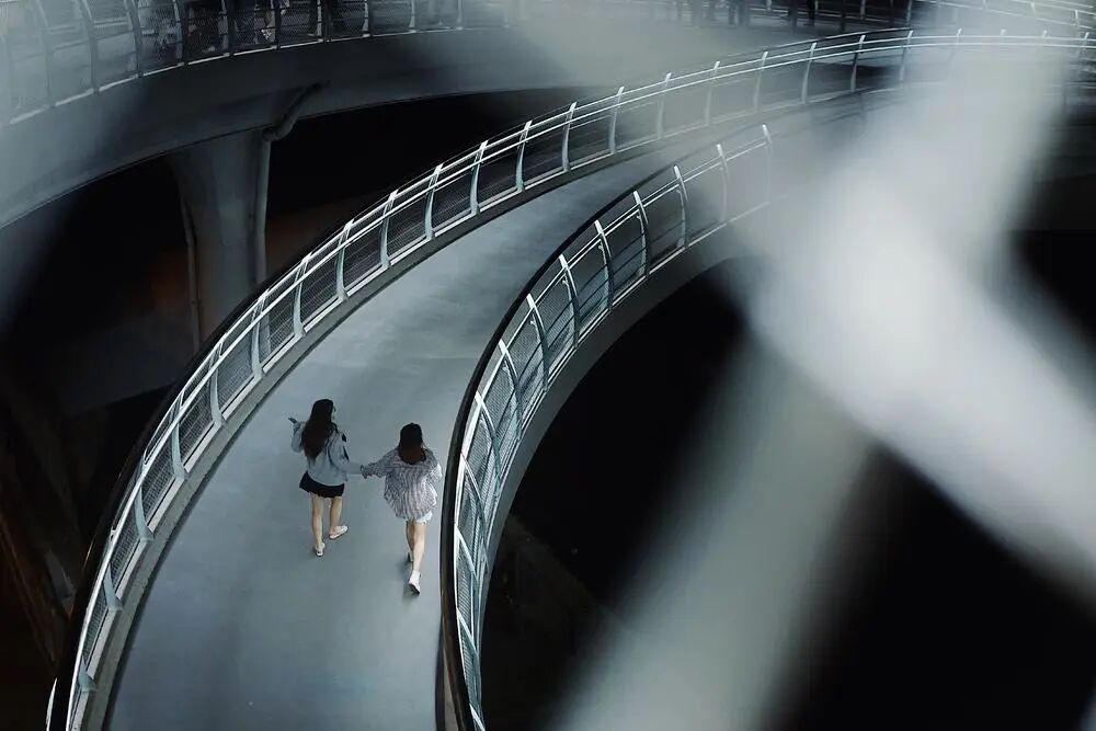 成都五一前刚修好的一个网红桥,平时人都很多,只能趁凌晨去拍,在主桥上隔着护网抓拍到辅桥上两个奔跑的小姐姐。为了突出主体后期用snapseed加了局部高光,并调成冷色调,想表达空旷都市里的一种疏离与困顿,也暗含了这座桥的主题,一个巨大的周而复始的莫比乌斯环。求校长点评!