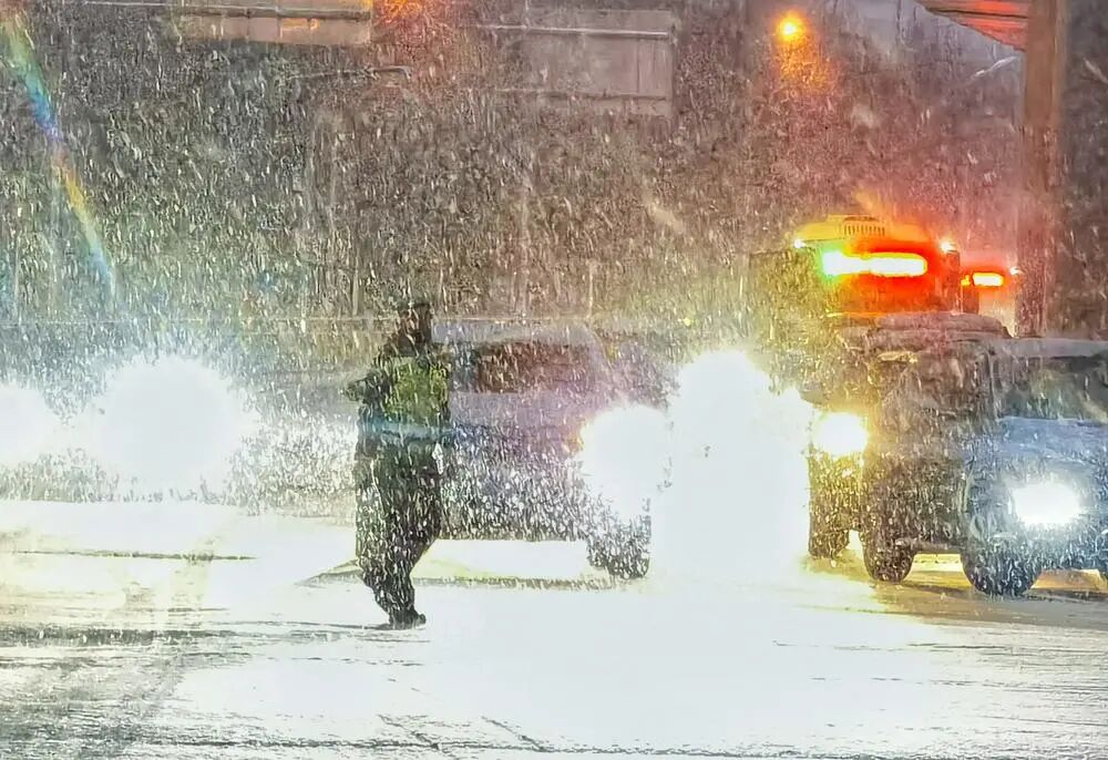 清晨起来开始下雪了,看见警察在雪里指挥交通非常感动,过马路的时候用手机拍了一张,车灯太亮了减了曝光还是过了,警察的主体还是清楚的