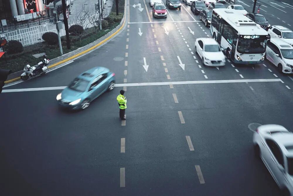 取景:天桥上,交警指挥交通的场景构图:交警作为主体放在画面左边三分之一的位置。人前留空。曝光:正常曝光虚实:全实。