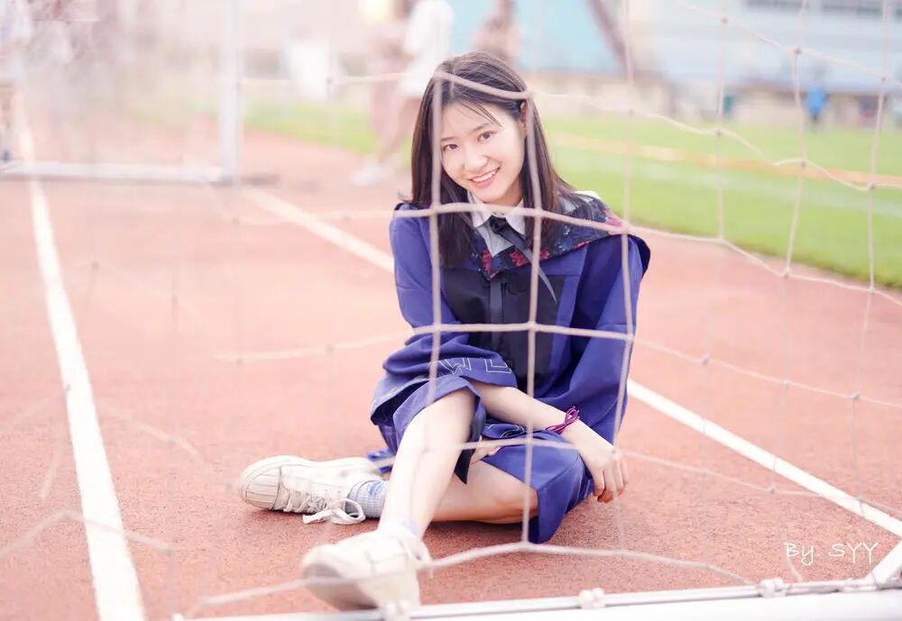 虚实方面,幸亏你虚化了,要不然背景实在太乱。可能操场人多吧。那么就找角度,等待。然后再让姑娘做表情。