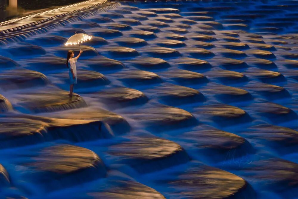 时隔一年了,中间旅游好多次,最近小伙伴们发现这里的蓝调能在慢门下面变成蓝色几何,于是前去。由于构图限制就不放后面的桥了(可以远处用200端收全的,但是人太小,还是突出人)时间:日落蓝调使用三脚架 + 慢门 + 固定 ISO + S 档,尝试了几次之后拍出后期:人像基本处理,补色,冷暖处理,细节打磨修复