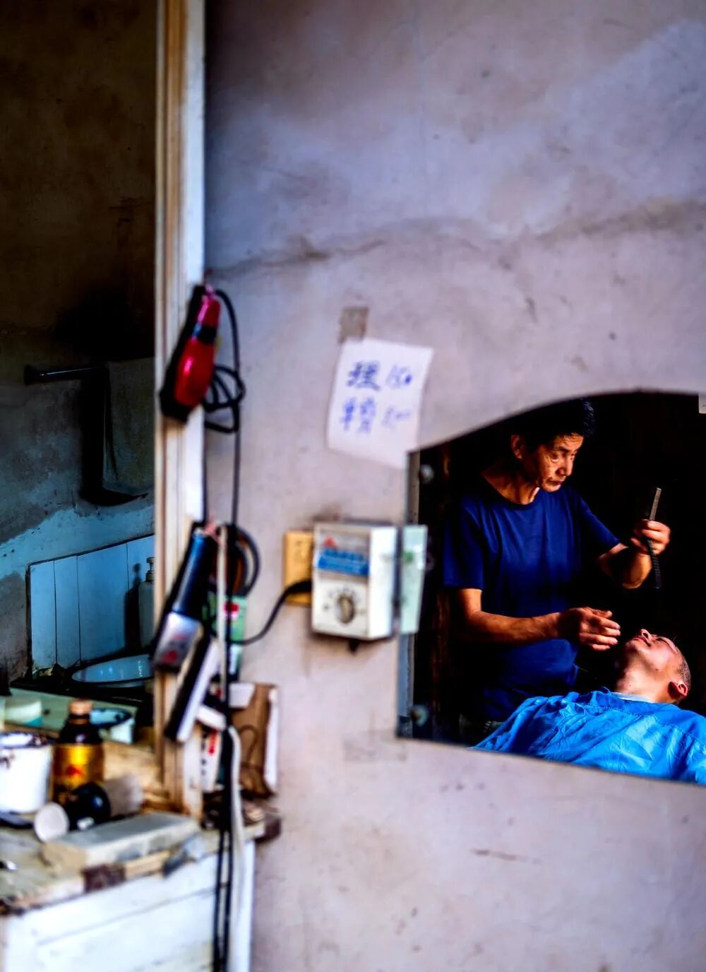 点评:理发馆里面对着镜子拍理发的人,其实是挺常见也很好的角度。