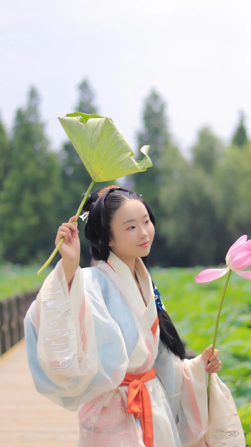然后这个姑娘也不知道看哪,也不知道摆了个什么POSE。背景完全可以找满荷塘的,非要带上路。