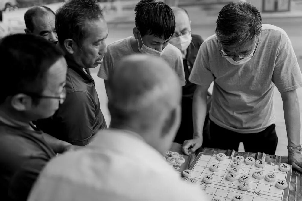 所以其实黑方眼镜大叔是四面楚歌。那么在画面中,我觉得你的镜头角度就放在红方白发爷爷的左边,和围观眼镜大哥中间。人缝中,去拍摄黑方眼镜大叔。