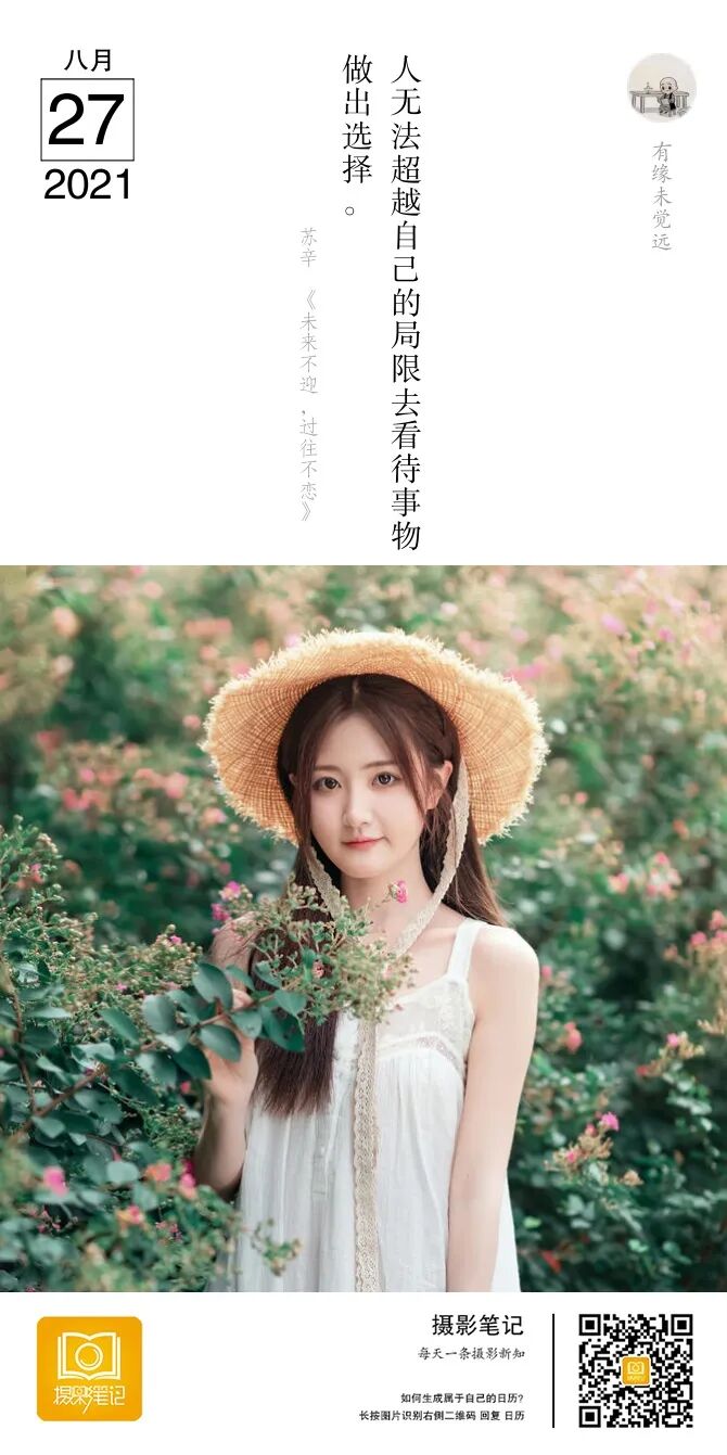 今天认真的按校长精炼的几个摄影步骤,写一下当时拍摄的思路。取景:公园里十字路口边上有几株紫薇花树,紫薇花还没有完全盛开,路口人来人往。为了规避杂乱和显得花比较多,就让小姐姐站到了花相对多的两棵树之间。构图:追求环境干净和花团锦簇的感觉,选择了居中构图曝光:绿色植物背景就减了一点曝光补偿。当时小姐姐来晚了,接近中午时分太阳比较毒,好在云有点多,选择太阳躲进云层光照相对柔和的时候拍摄。虚实:人物实背景花虚,突出人物也显得花多。后期:因为是逆光脸稍微有点黑,后期提亮阴影同时压高光减少光比,让画面显得柔和舒服。