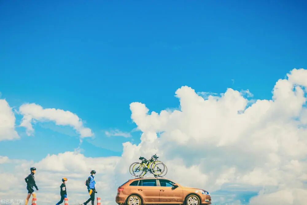 车子,车子上面的自行车,几个人的装扮。真的是太好了。非常搭调。