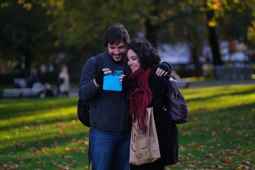 英国海德公园,自拍后一起观看照片的情侣,抓拍了几张,感觉这张表情最为生动