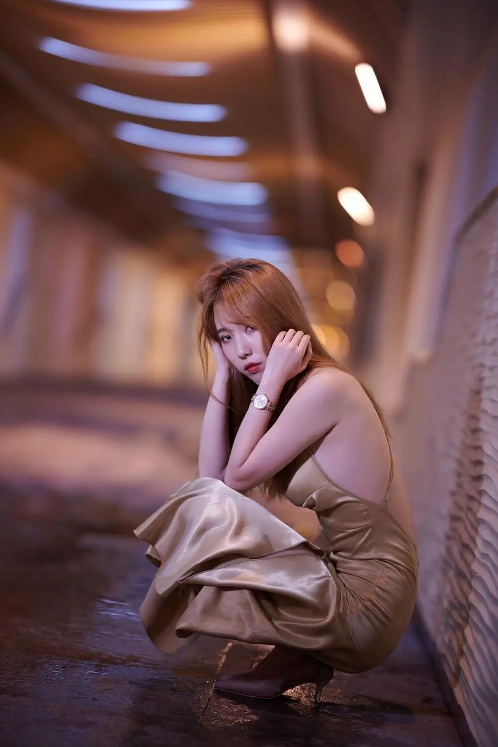 雨夜在一个人行地道拍的一组环境人像。环境是暖黄色的路灯,相机上调整了白平衡,肤色不至于偏的太多。有LED灯补光。妹子脸部有小瑕疵,下巴受伤贴了个创可贴,由于ISO比较高300,400,后期难度很大,一修就糊掉了,用摆姿尽量遮挡。希望宁老师指点一下,有哪些问题可以改进。谢谢!