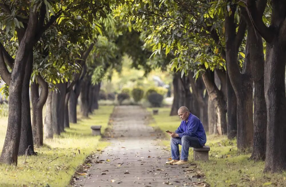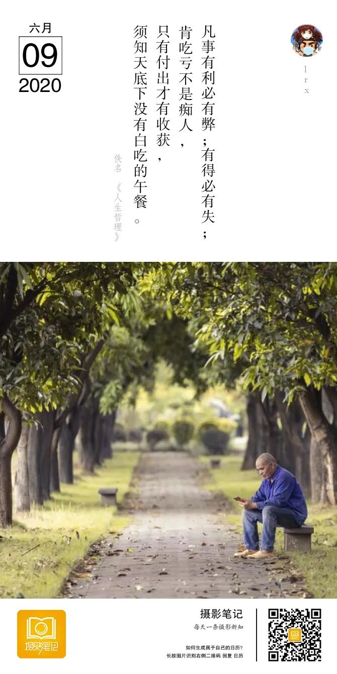 今天中午,小区花园,阴天,好天气,虽然很闷热,然手痒想拍拍,遂拿着刚入手的5D4+70-200大三元在小区里晃荡,出门就看到隔壁忙碌了一早上的装修师傅,吃完午饭后在树荫底下休息,专心致志,忘我地刷着手机,有只蚊子在脑袋上吸血都浑然不觉。是在刷着抖音?还是在跟工友侃大山?亦或是跟老婆儿女视频聊天,不得而知,微微笑容让我感到宁静祥和,最终举起了相机拍下这一幕。内心活动很长,其实也就是在电光火石之间,拍完不到一分钟他站起来干活去了。既然师傅身穿蓝衣牛仔裤,就主体进行了加深冷色调处理,环境暖色调处理以跟主体突出对比