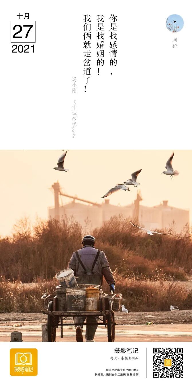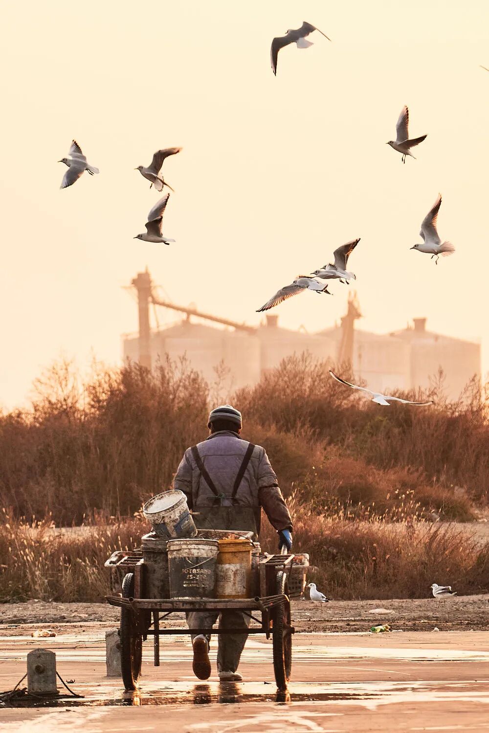 点评:飞着的海鸥,一个人拖着车的背影,加上光线。真的是不错的一张照片。