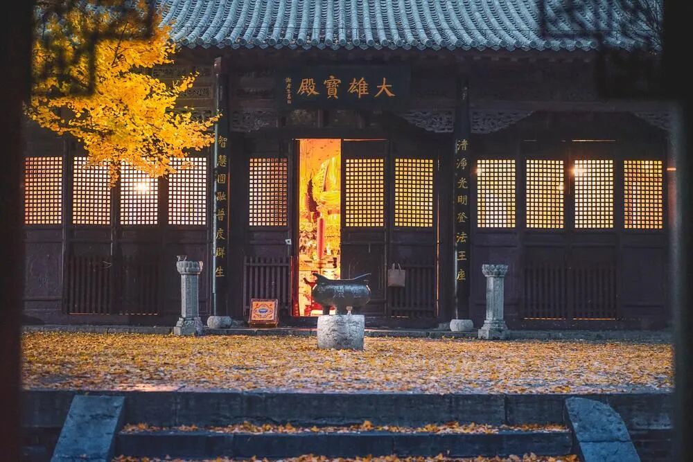 秋日银杏的黄与寺庙内透出的暖光交相呼应 半掩的门透出半身佛像增加神秘感
