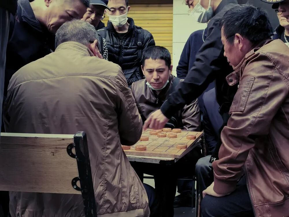 点评:这张照片主体人物的表情抓得非常好,确实一看过去就是纠结。伸出手的大哥在给支招。他自己是紧锁眉头。周围的人都在观战。这个瞬间非常好。把一个遇到困难棋局的人表现出来了。