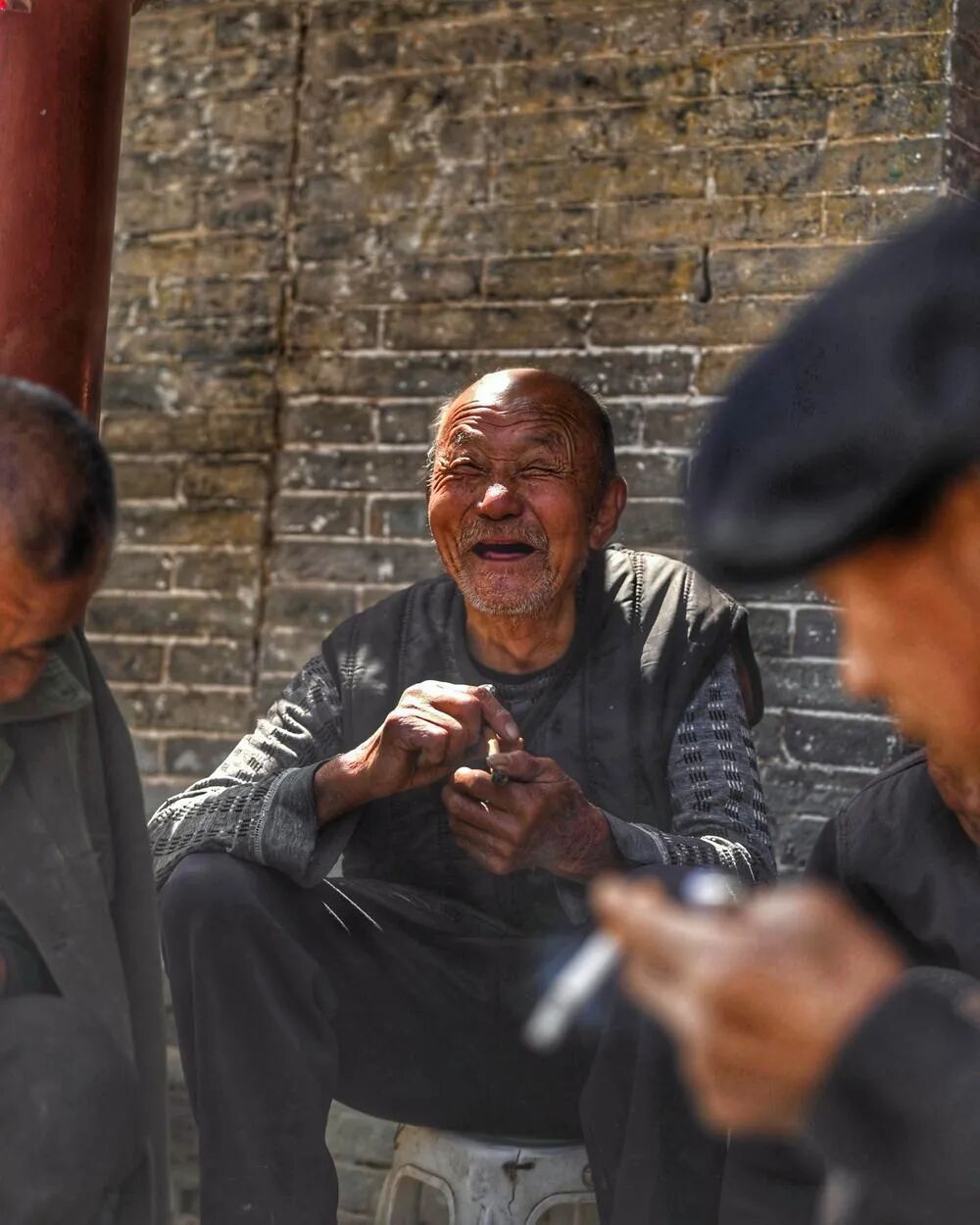 要么就让画面中离你近的两个老人作为一个框架,你尽量虚化前景。这样也会让笑着的老人更加明显。拍摄角度就需要好好找找了,甚至还要等等时机。