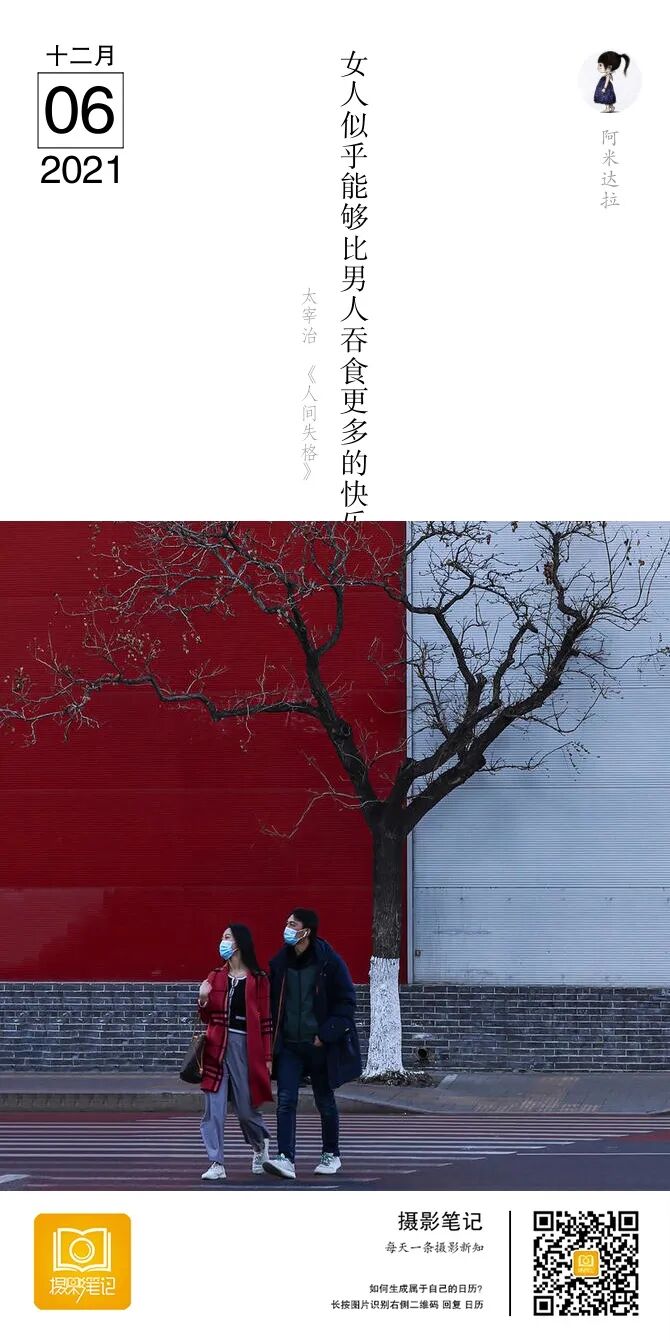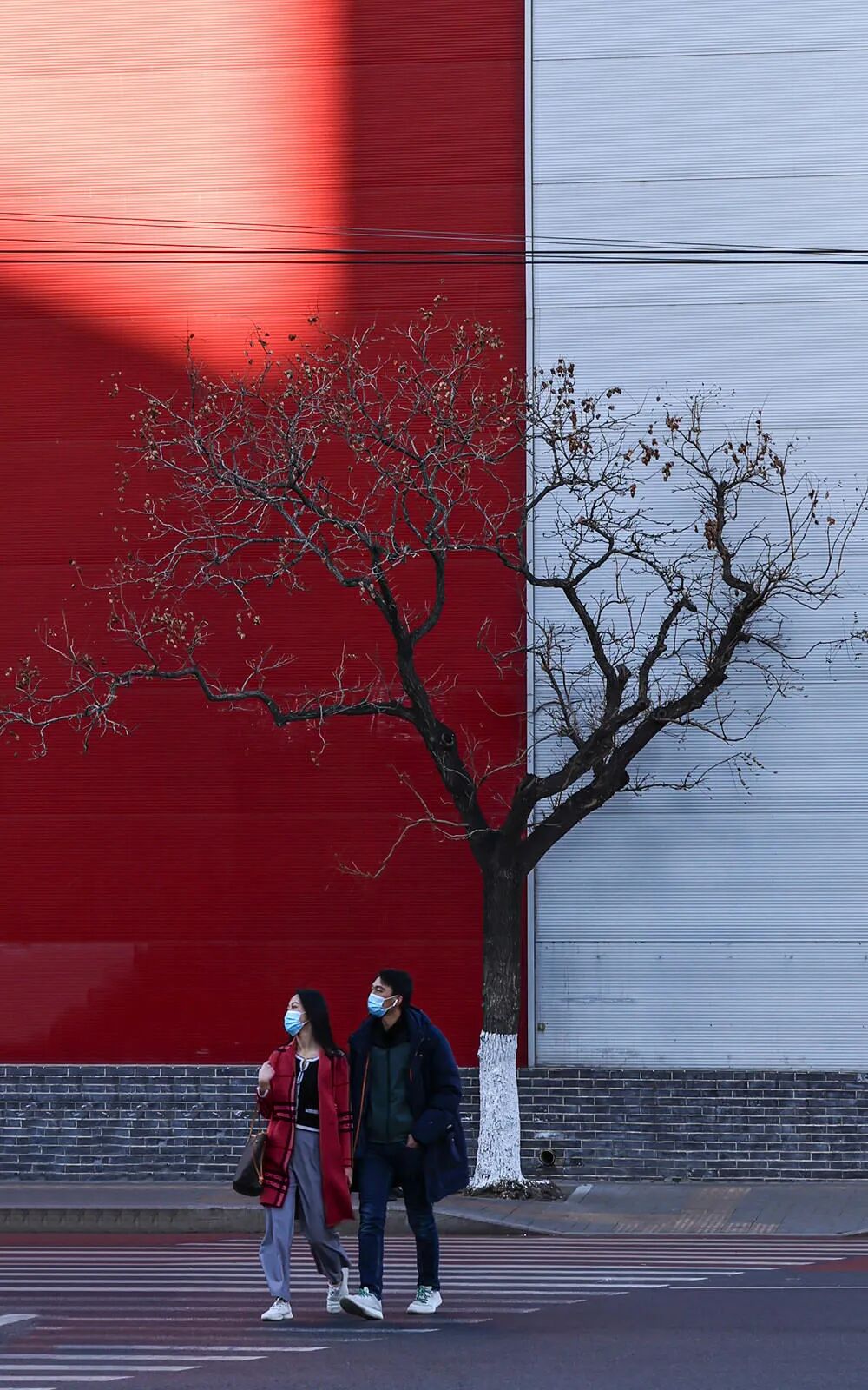 拍摄角度要让树在红白的中间。越压中线,形式感越强。