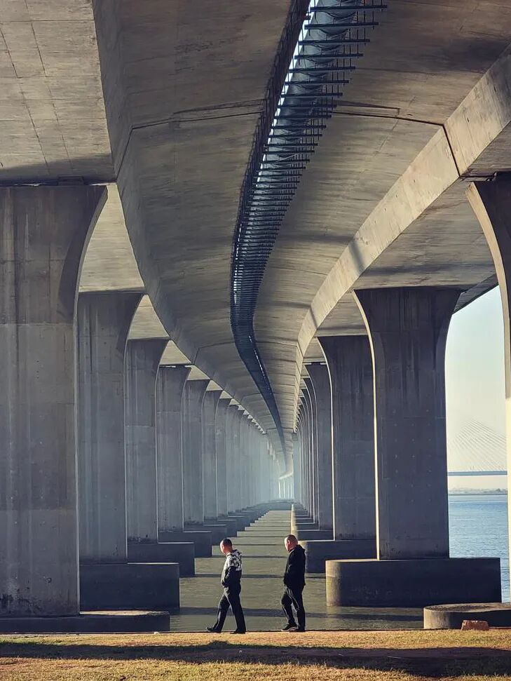 出差广州南沙,珠江湾清晨散步,从凫洲大桥下过,遇路人经过,手机拍摄。