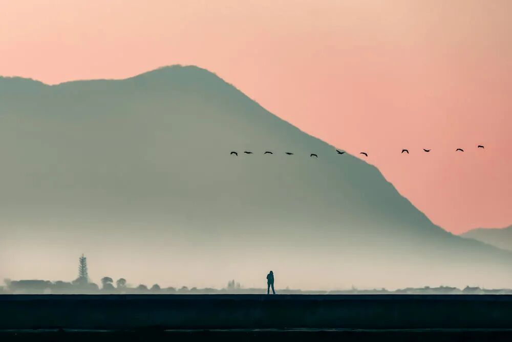 点评:这一行飞鸟实在是太棒了,以至于我一直不确定是不是后期做的。我有一些方法可以去看是不是后期的。我在PS里调节之后看不出是后期加的。但是因为这行鸟太完美了,所以还是不能确定。